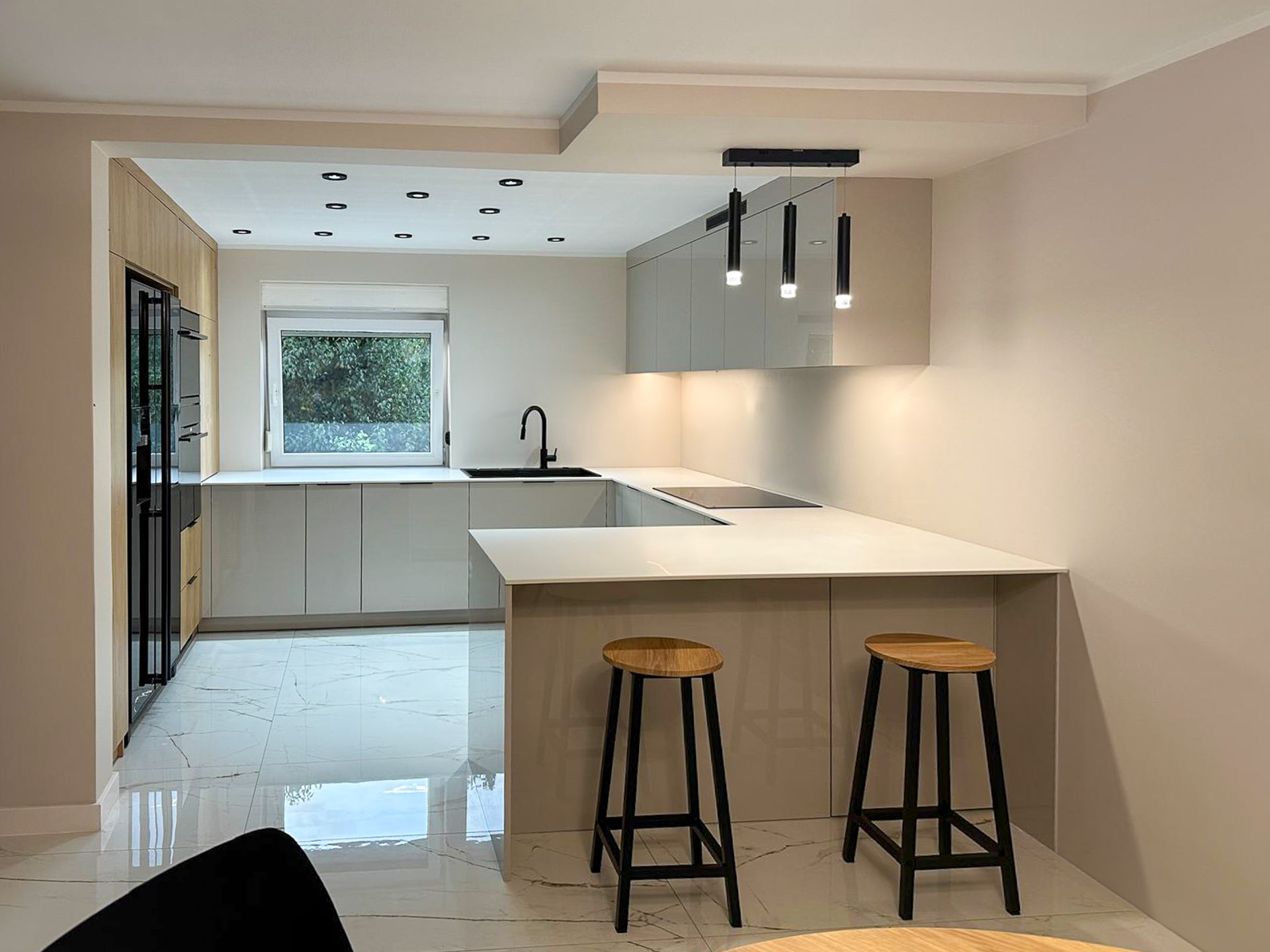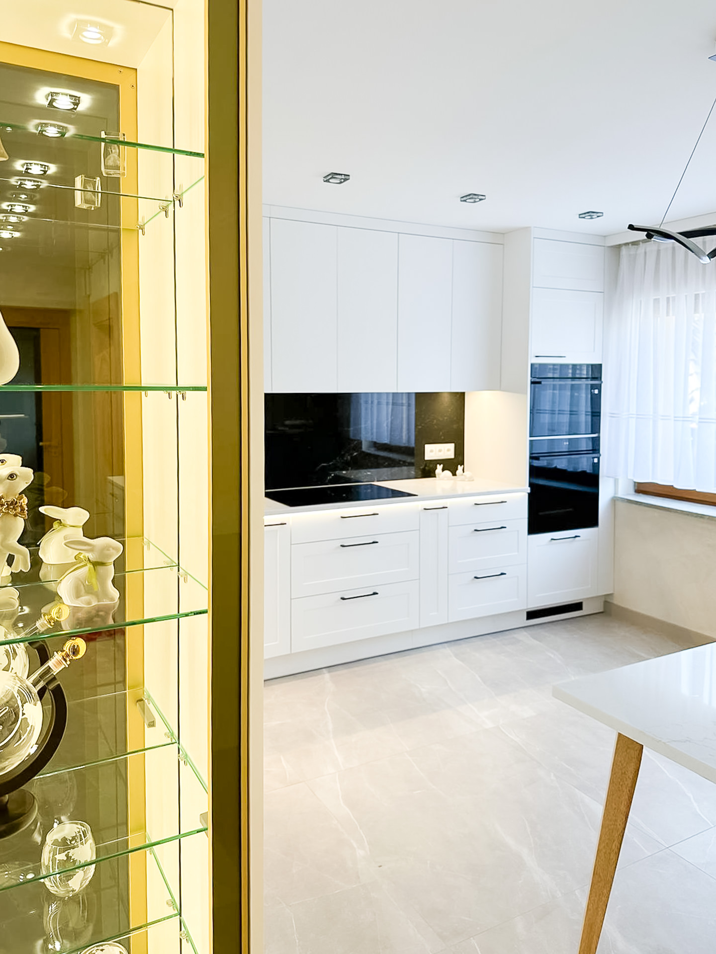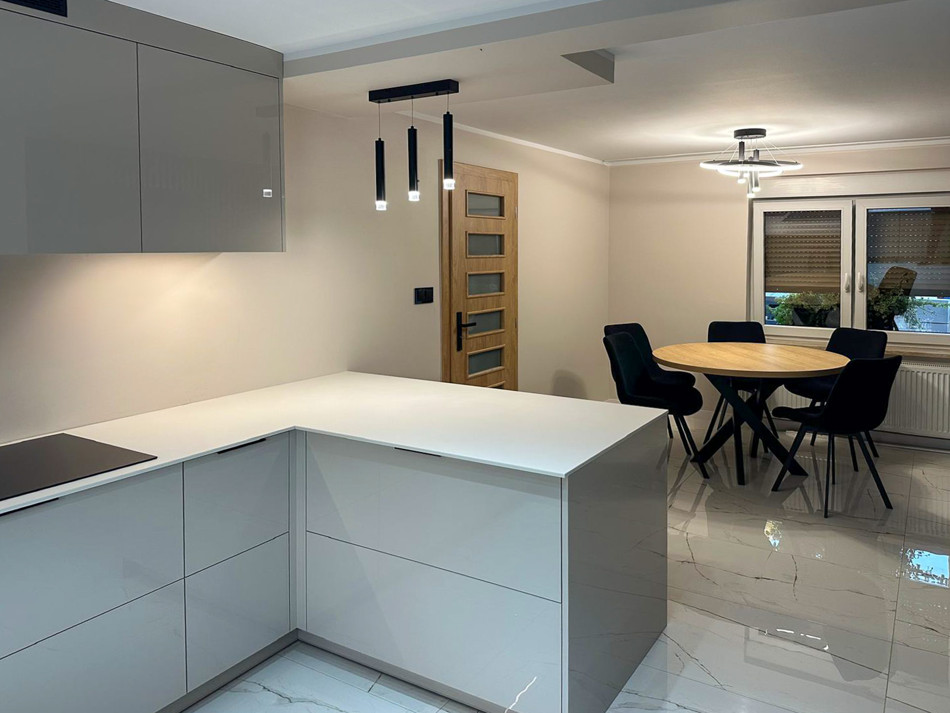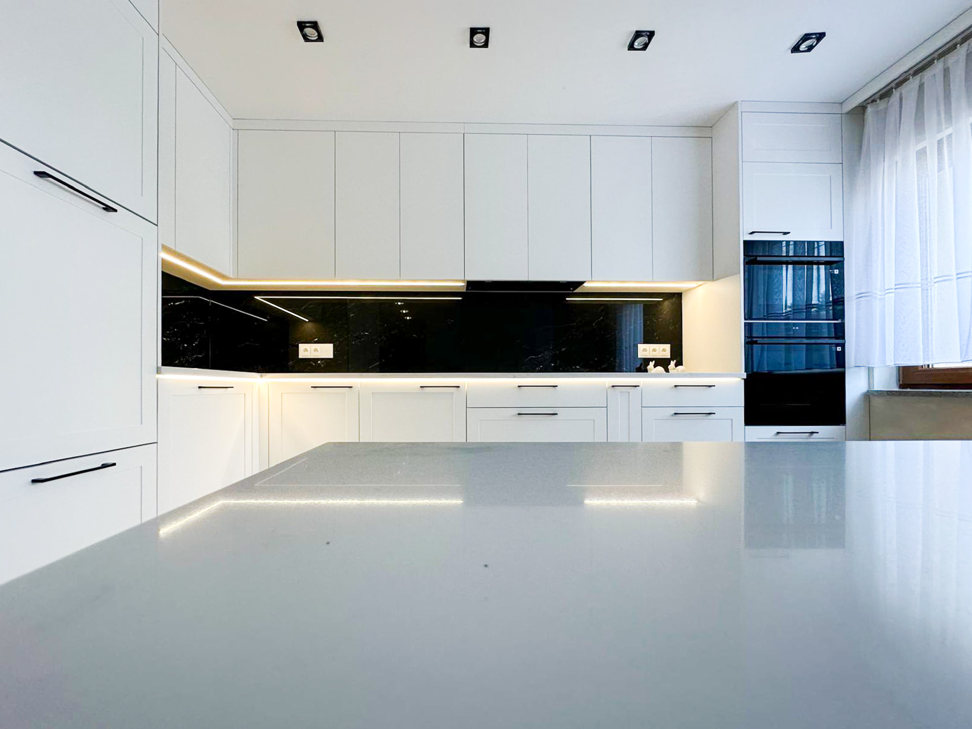Ręcznie lakierowane białe fronty, blat imitujący beton, system okuć z dożywotnią gwarancją marki BLUM. Ukryta spiżarnia, kuchnia połączona z ergonomiczną wyspą.