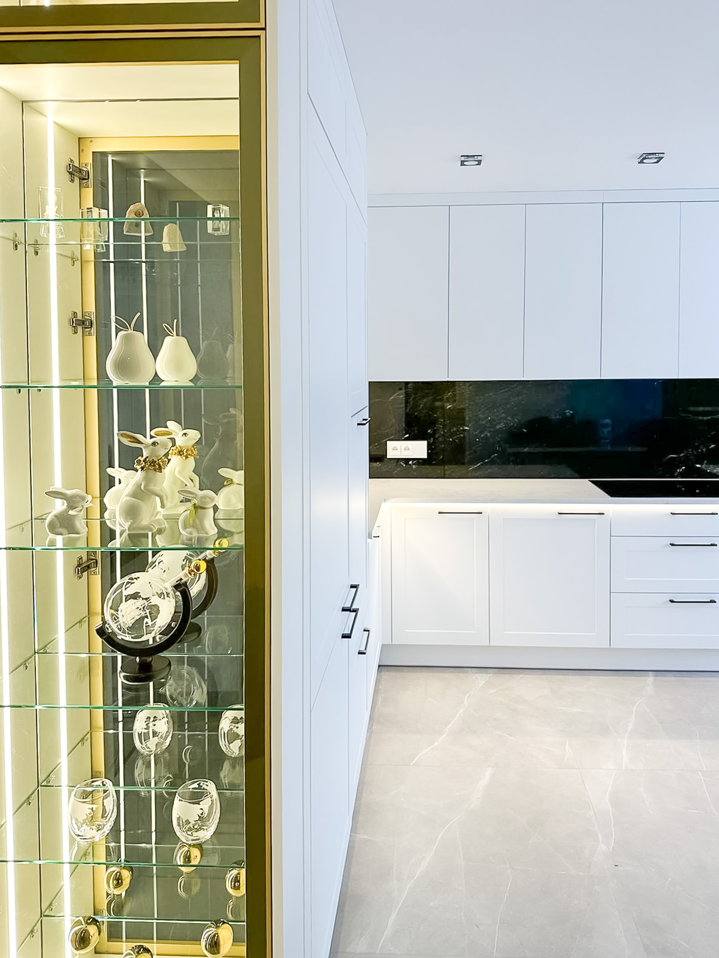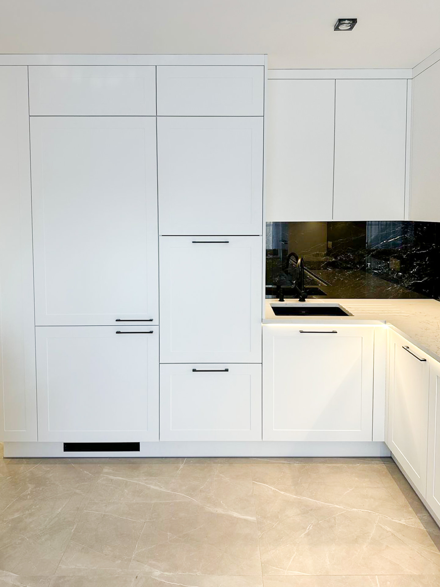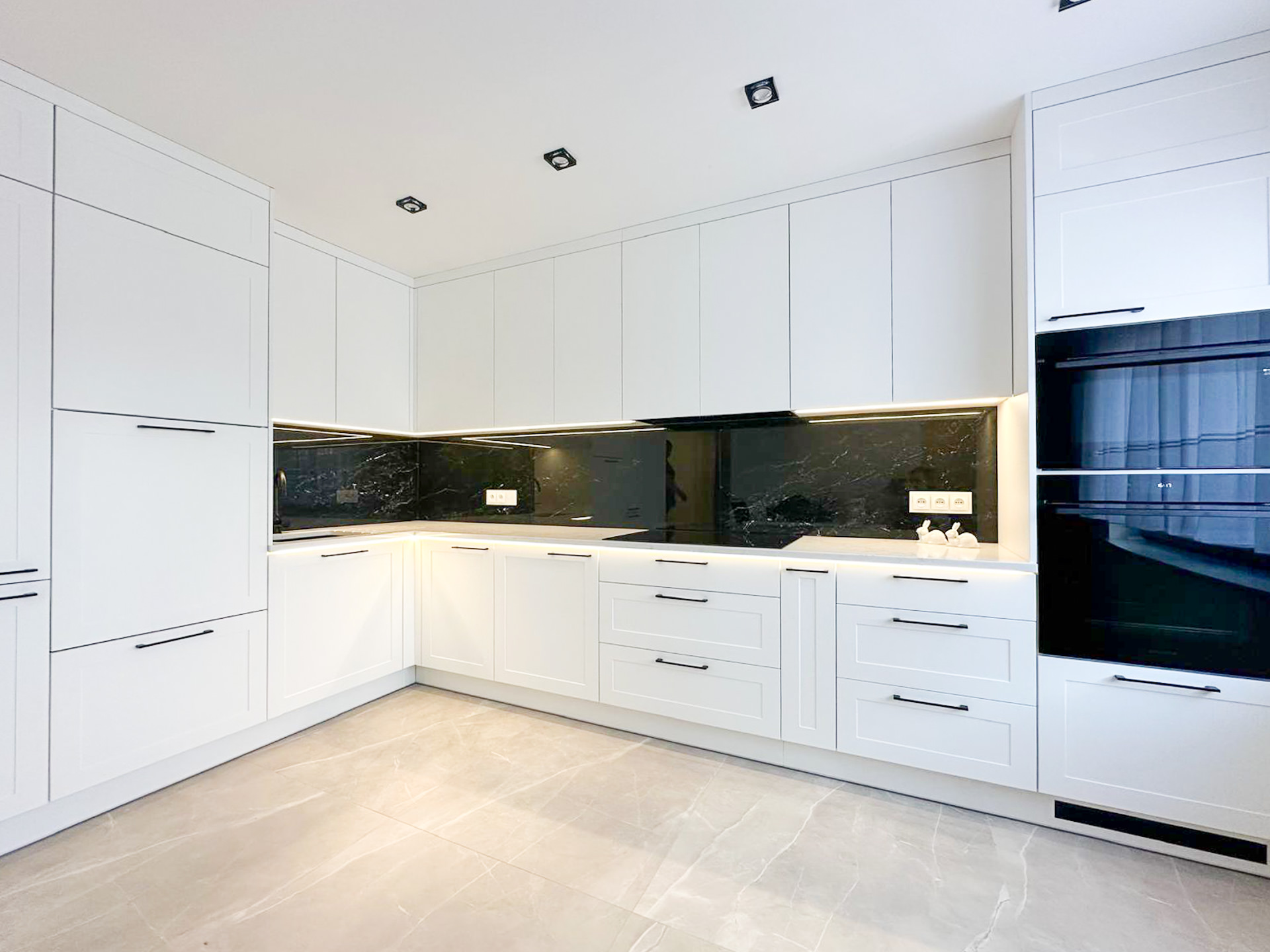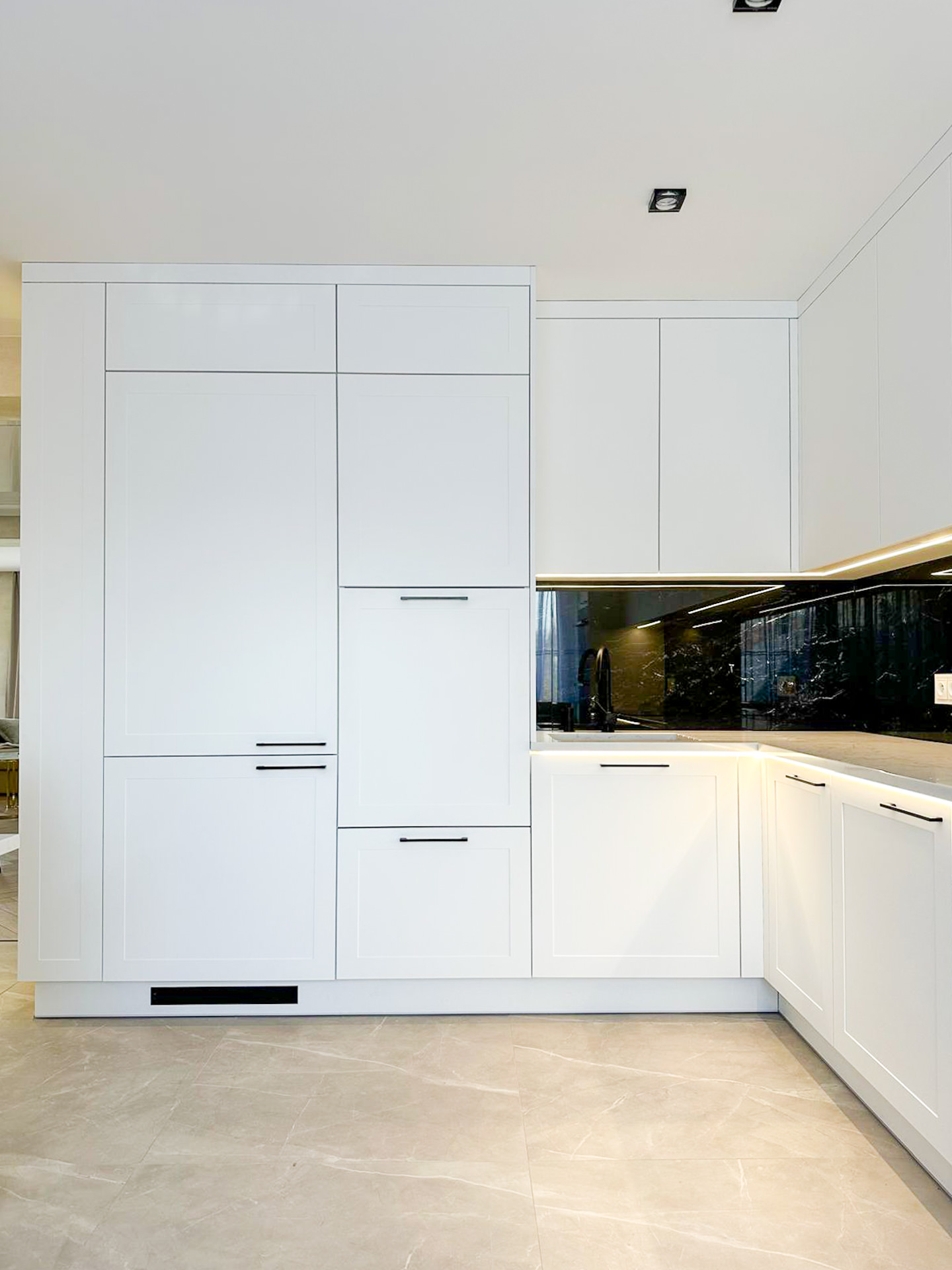 Ręcznie lakierowane białe fronty, blat imitujący beton, system okuć z dożywotnią gwarancją marki BLUM. Ukryta spiżarnia, kuchnia połączona z ergonomiczną wyspą.
