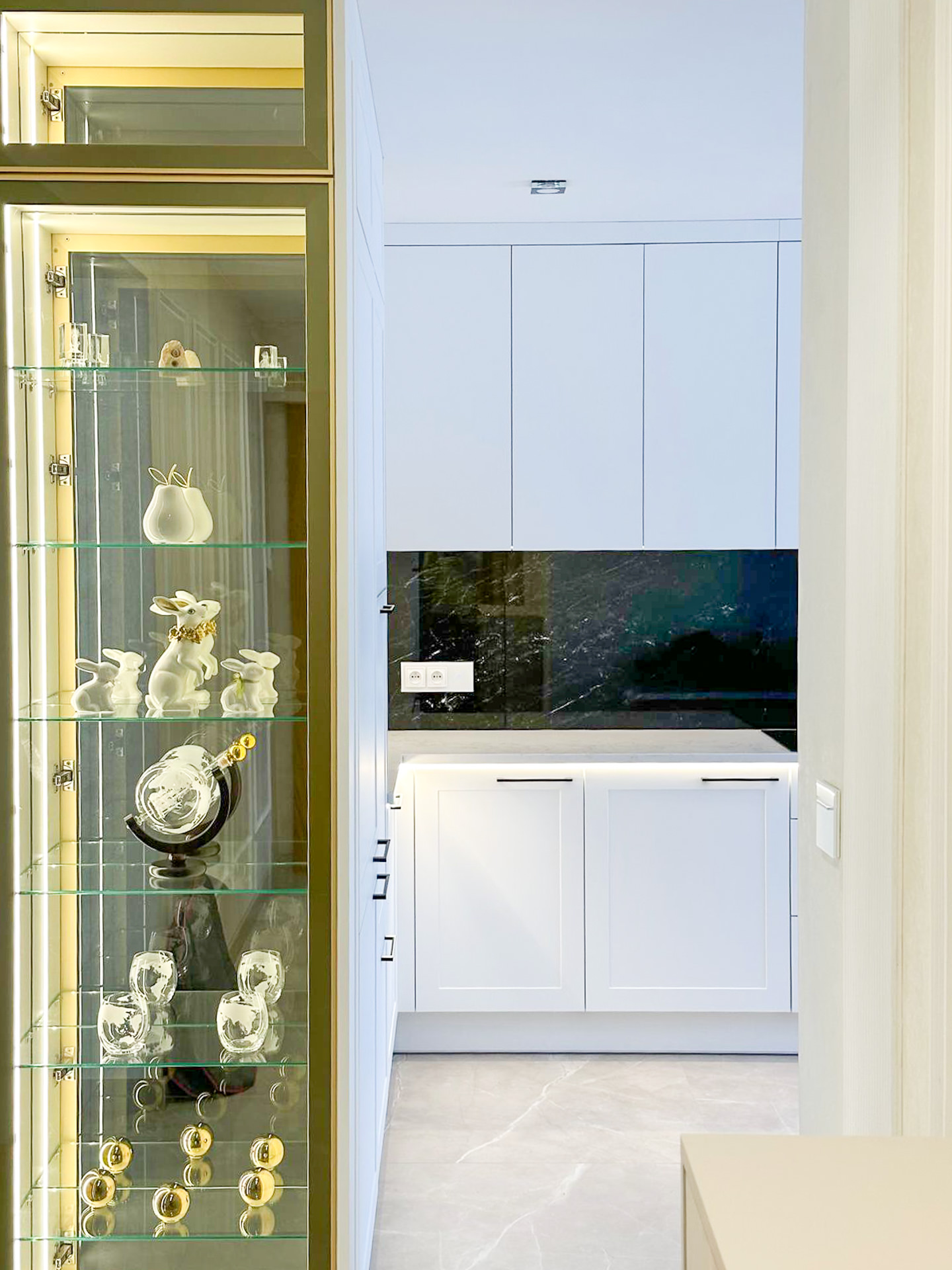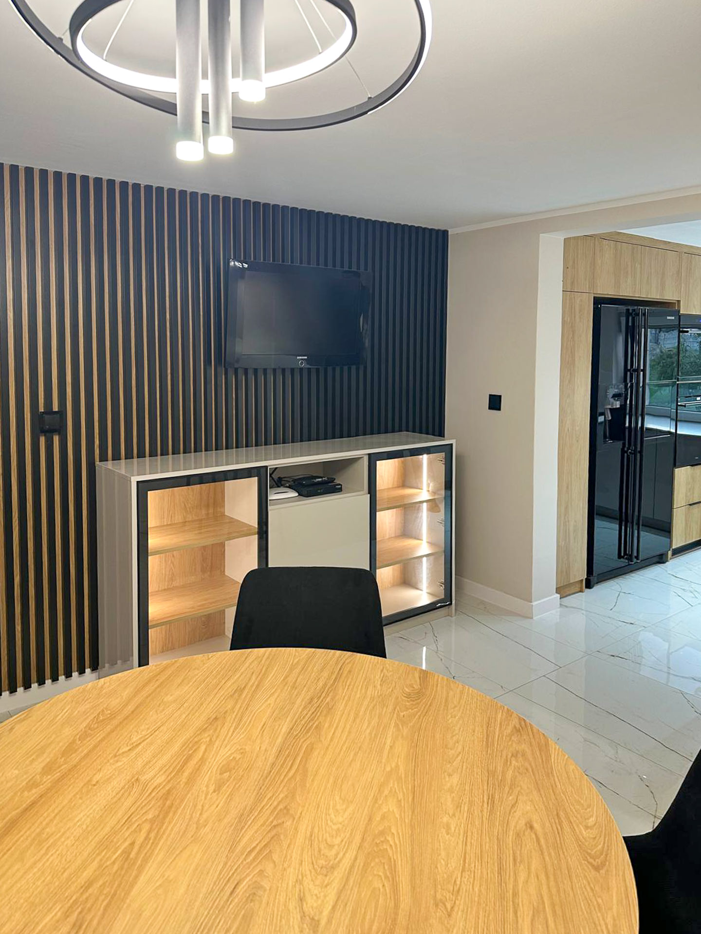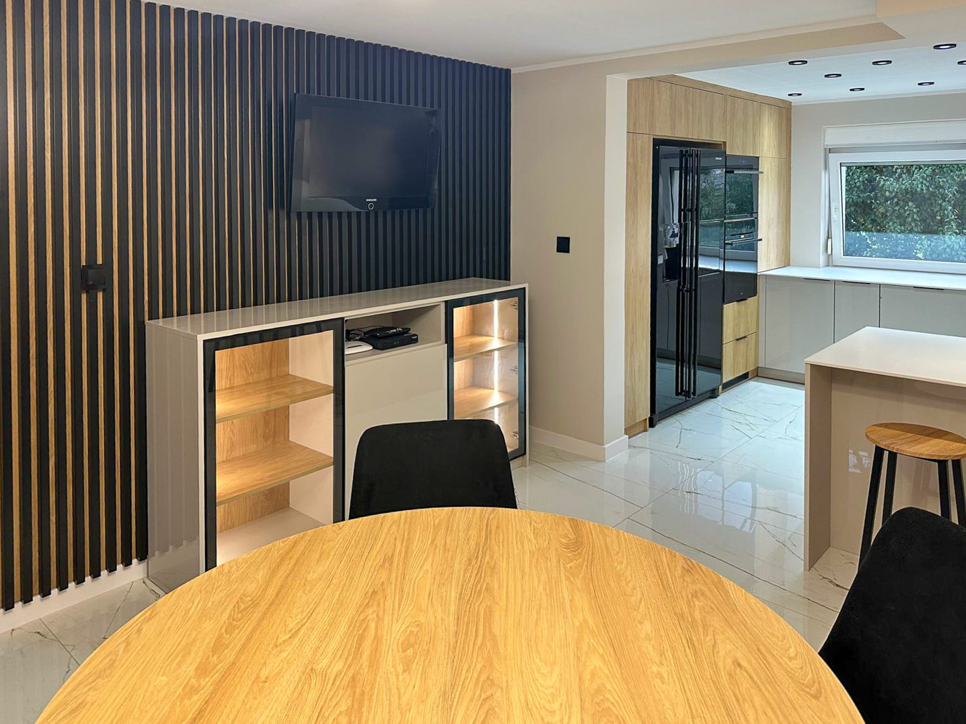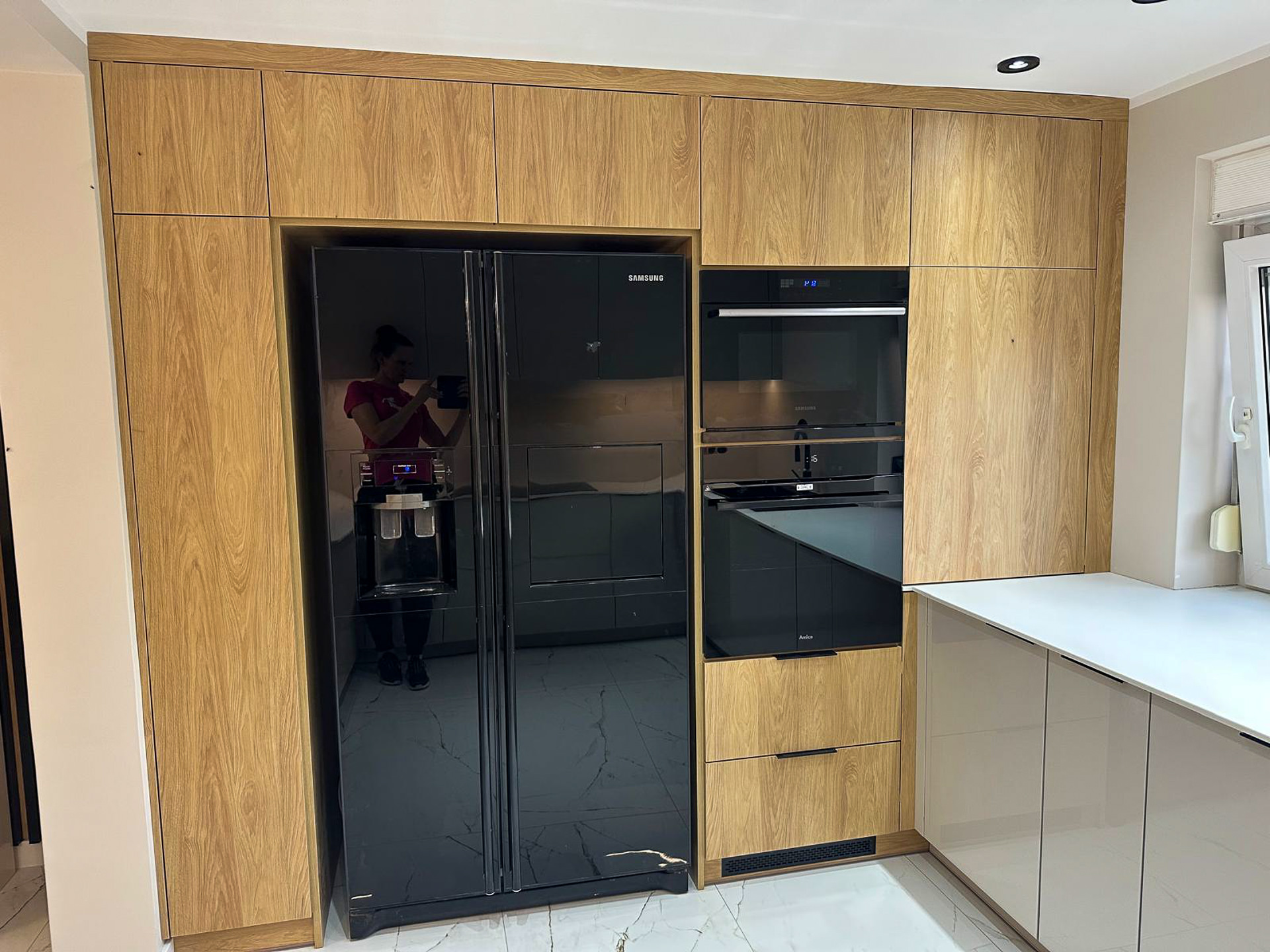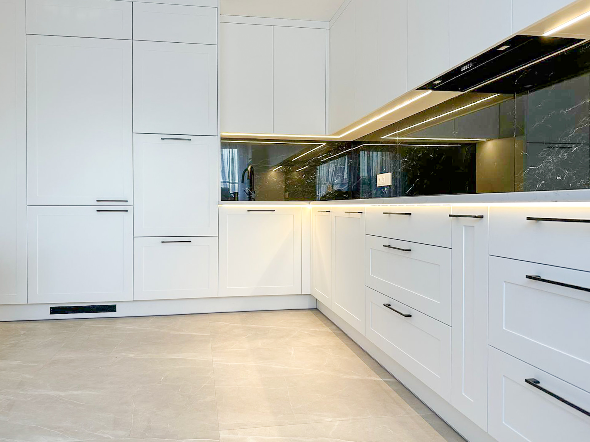 Ręcznie lakierowane białe fronty, blat imitujący beton, system okuć z dożywotnią gwarancją marki BLUM. Ukryta spiżarnia, kuchnia połączona z ergonomiczną wyspą.