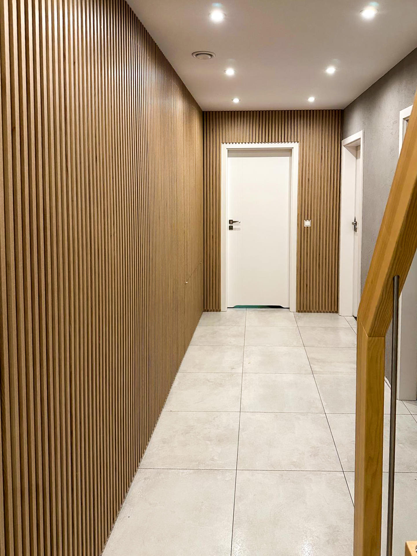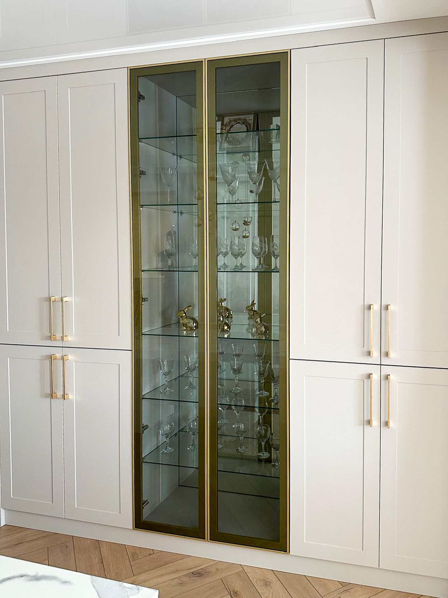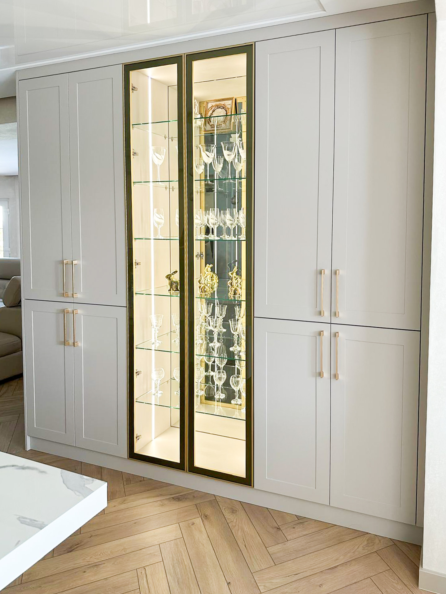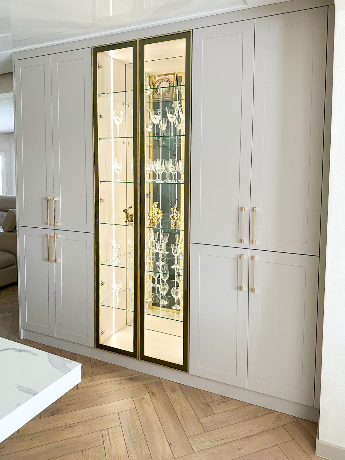 Ręcznie lakierowane białe fronty, blat imitujący beton, system okuć z dożywotnią gwarancją marki BLUM. Ukryta spiżarnia, kuchnia połączona z ergonomiczną wyspą.