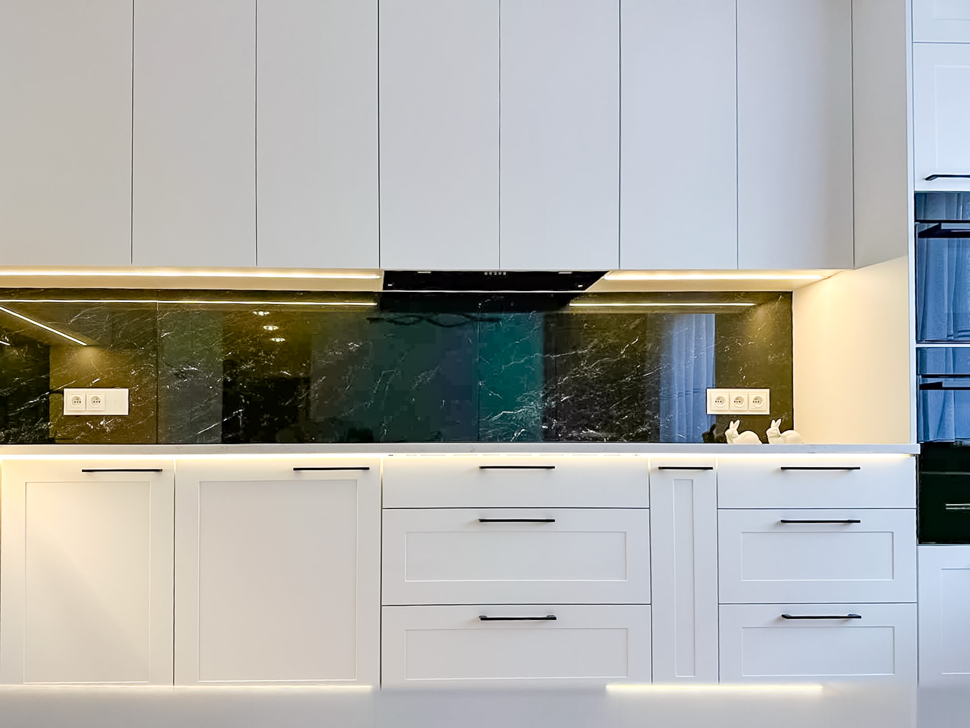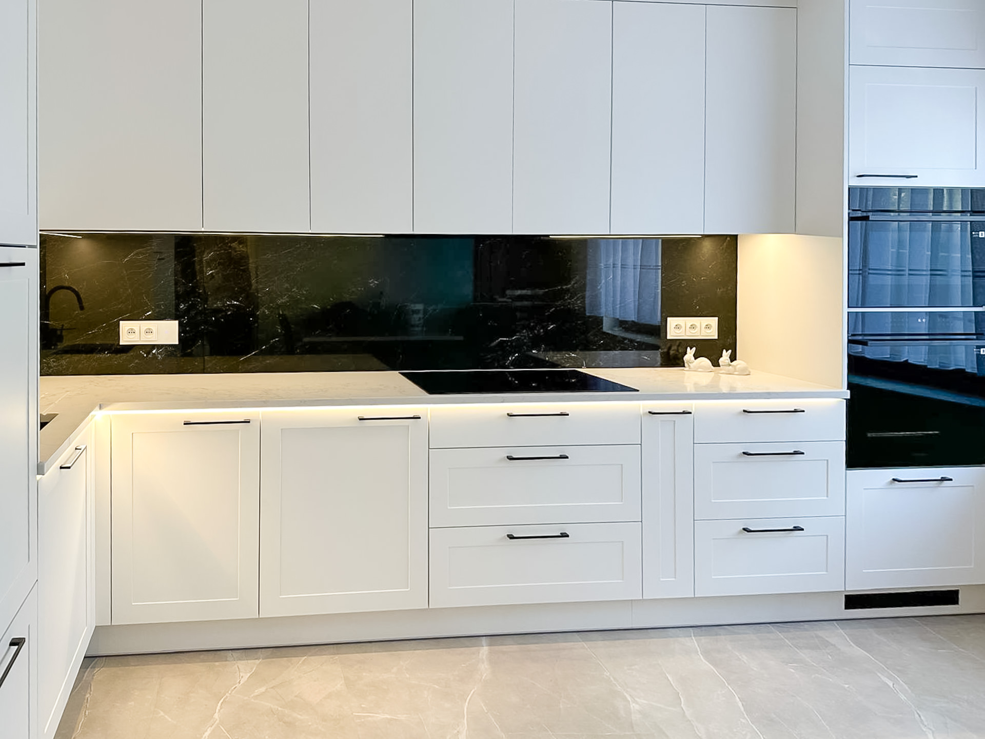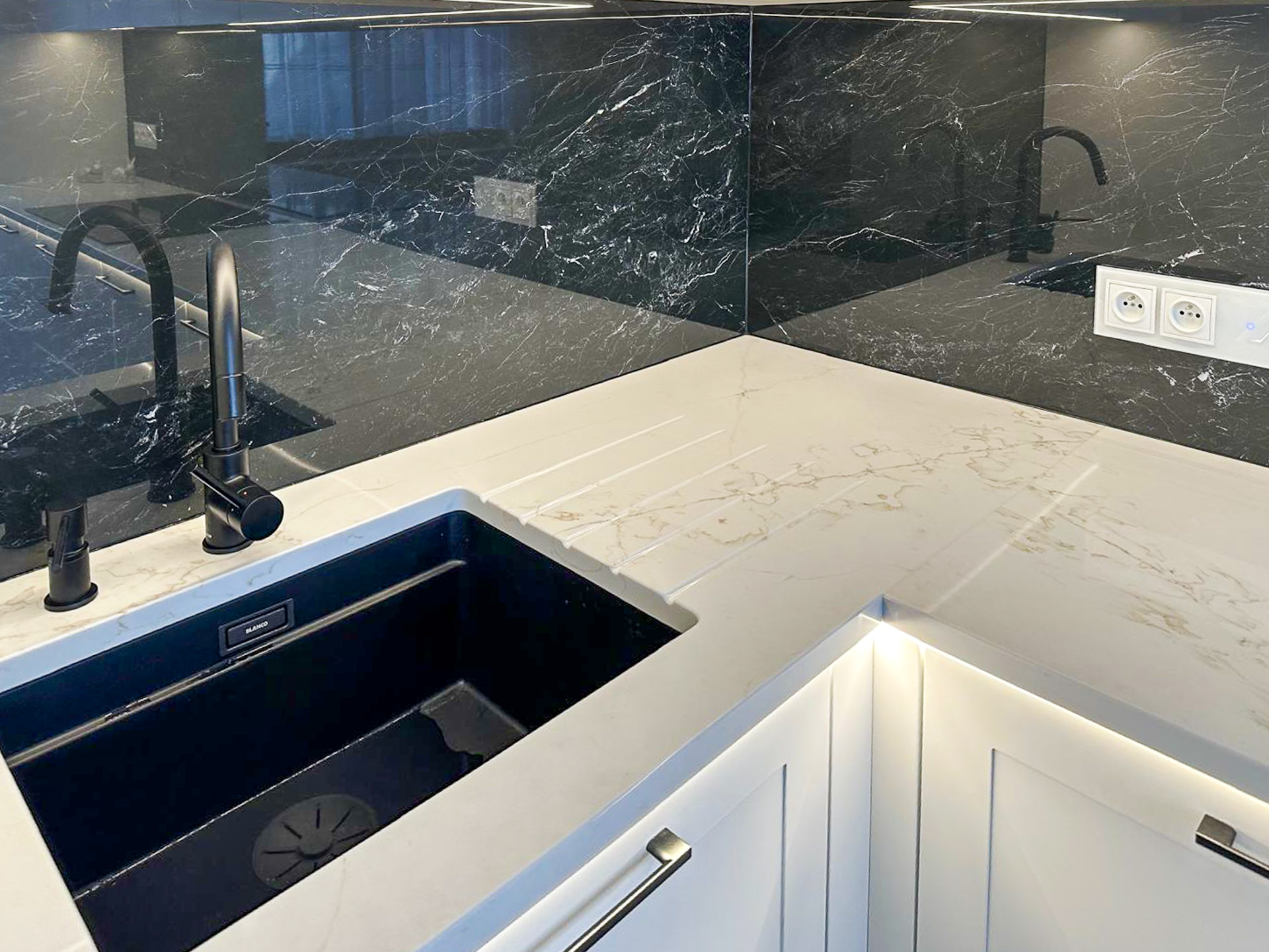 Naturalny fornir „Palisander Brazylijski” Ręcznie lakierowane białe fronty, blat granitowy w połysku – polerowany. System okuć z dożywotnią gwarancją marki BLUM. Podwieszany zlewozmywak Blacno. Czarne szkło Lacobel – połysk. System do szafki narożnej „Nerka” Le Manse.