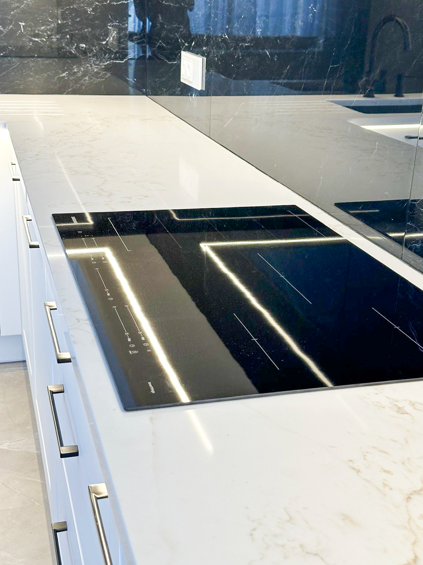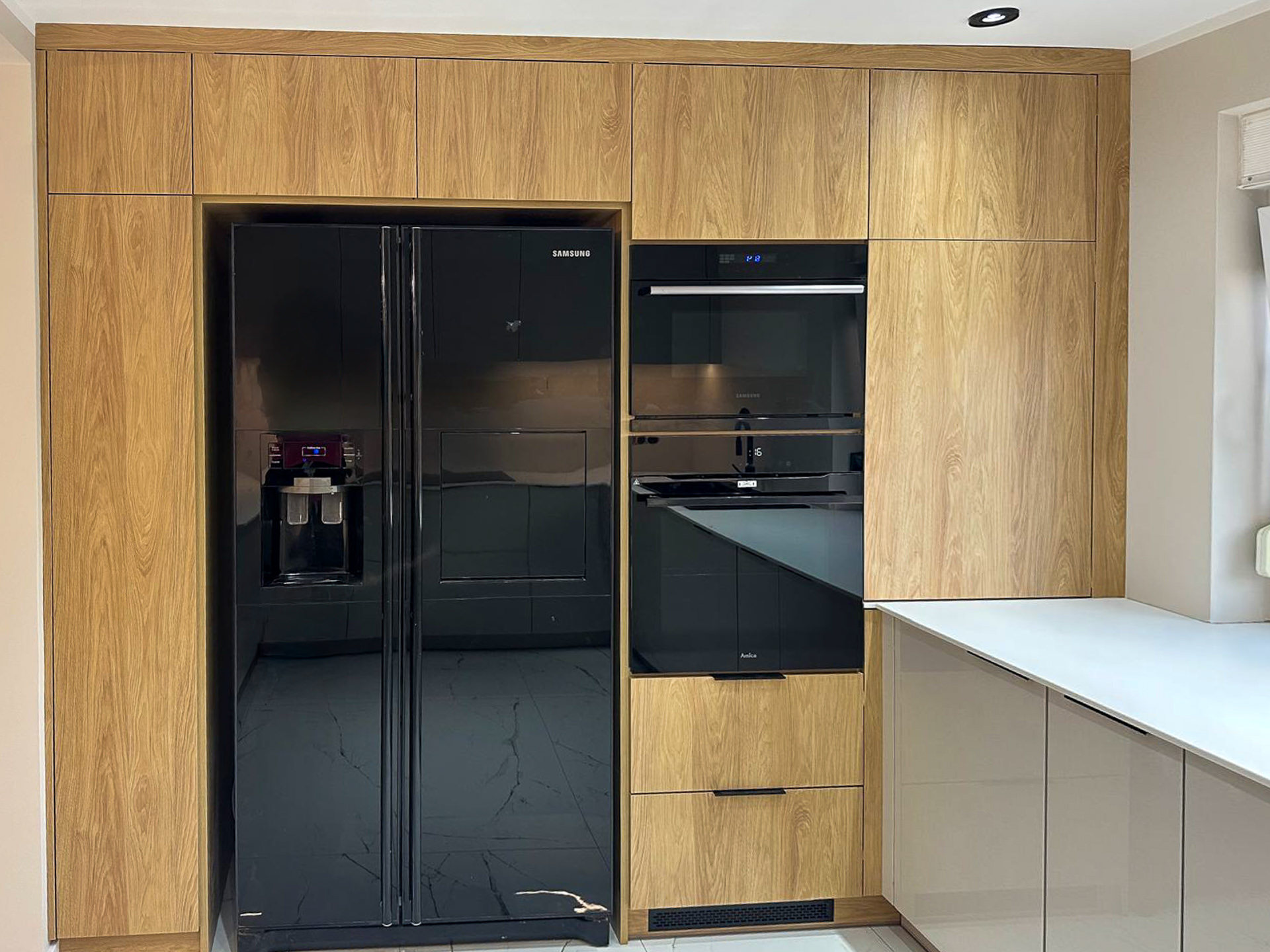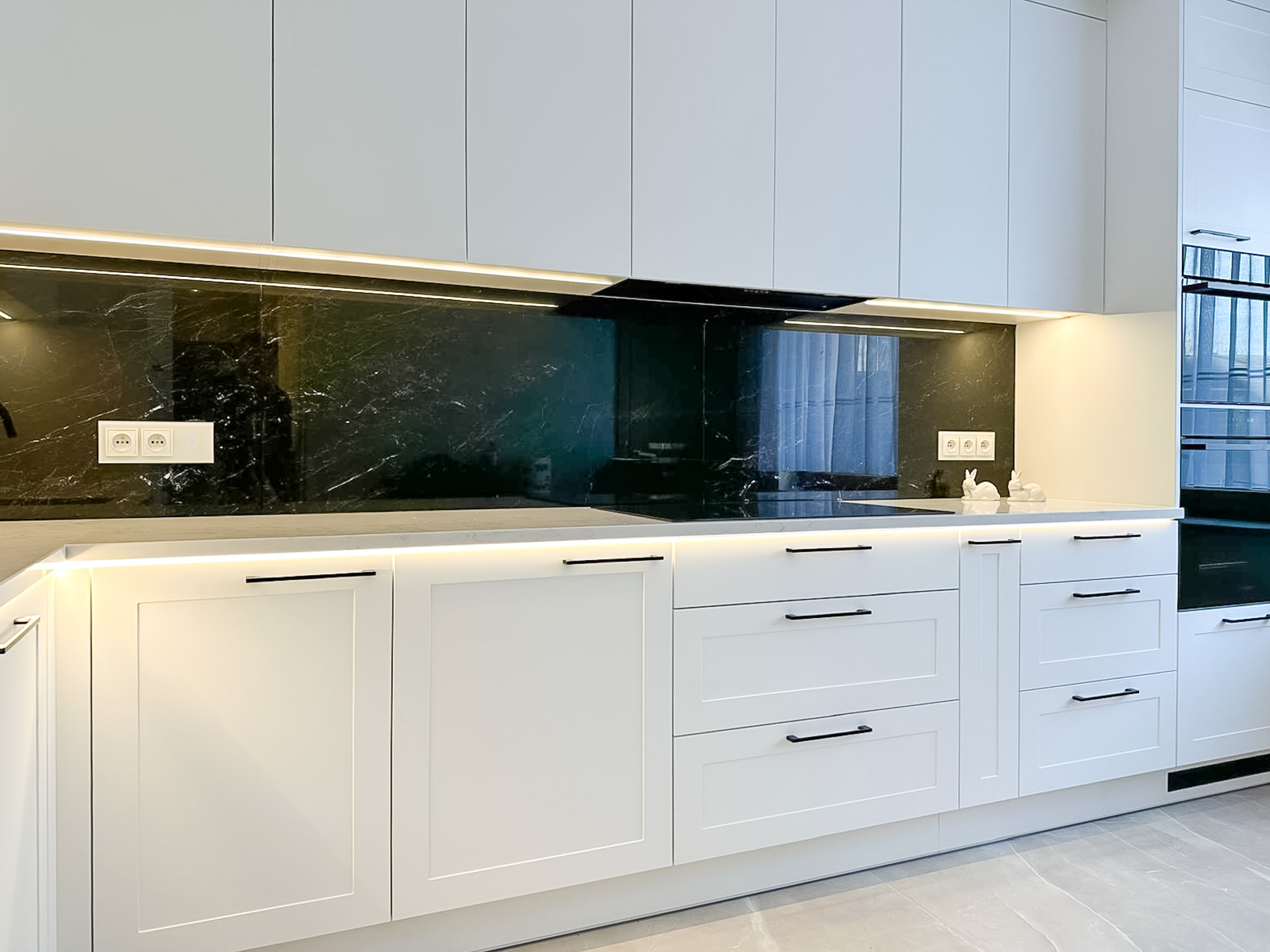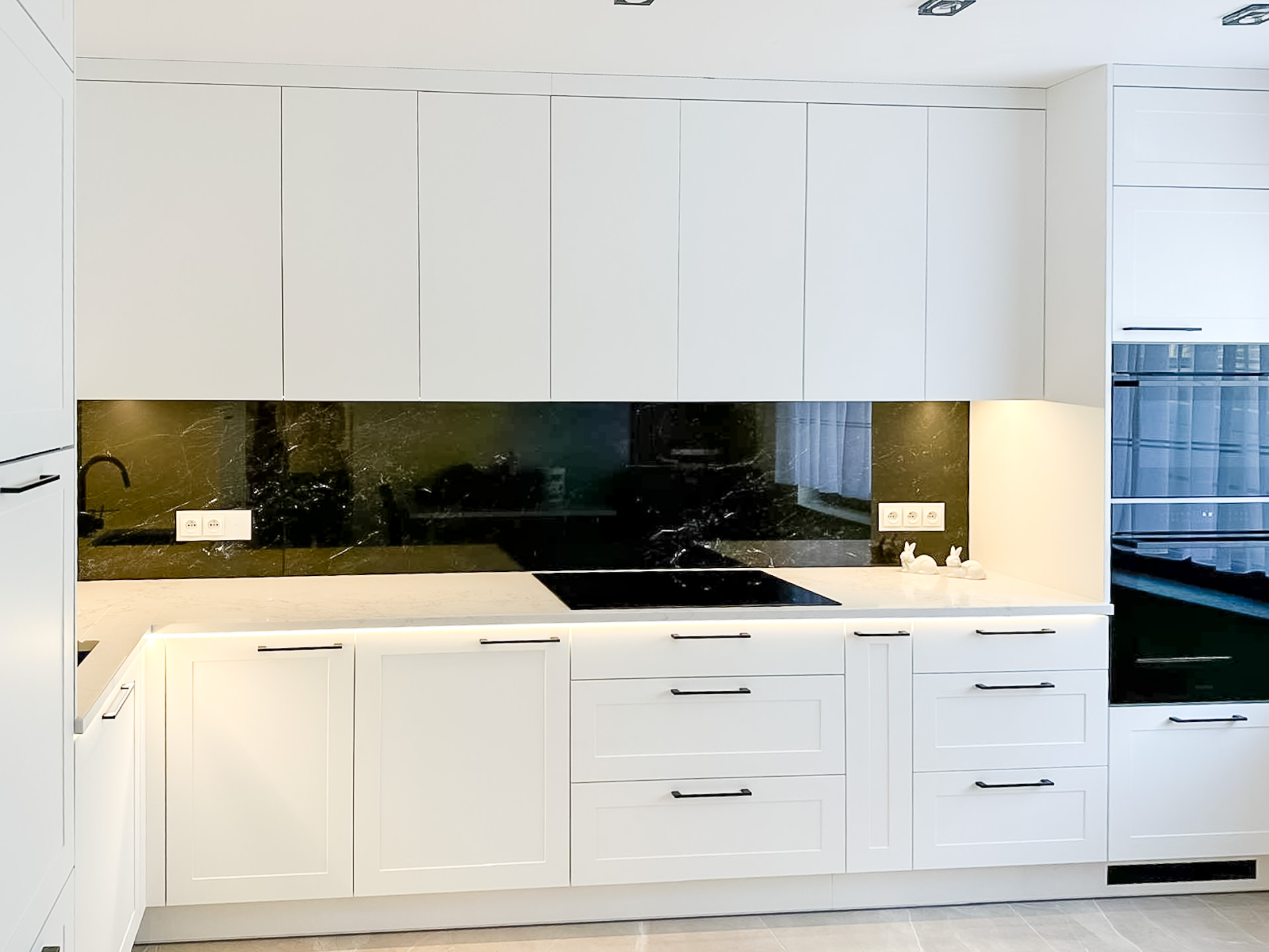 Naturalny fornir „Palisander Brazylijski” Ręcznie lakierowane białe fronty, blat granitowy w połysku – polerowany. System okuć z dożywotnią gwarancją marki BLUM. Podwieszany zlewozmywak Blacno. Czarne szkło Lacobel – połysk. System do szafki narożnej „Nerka” Le Manse.