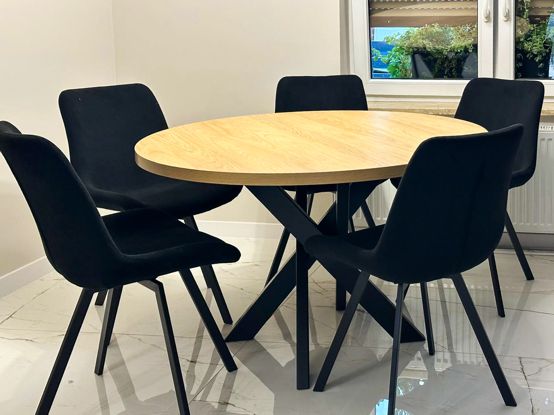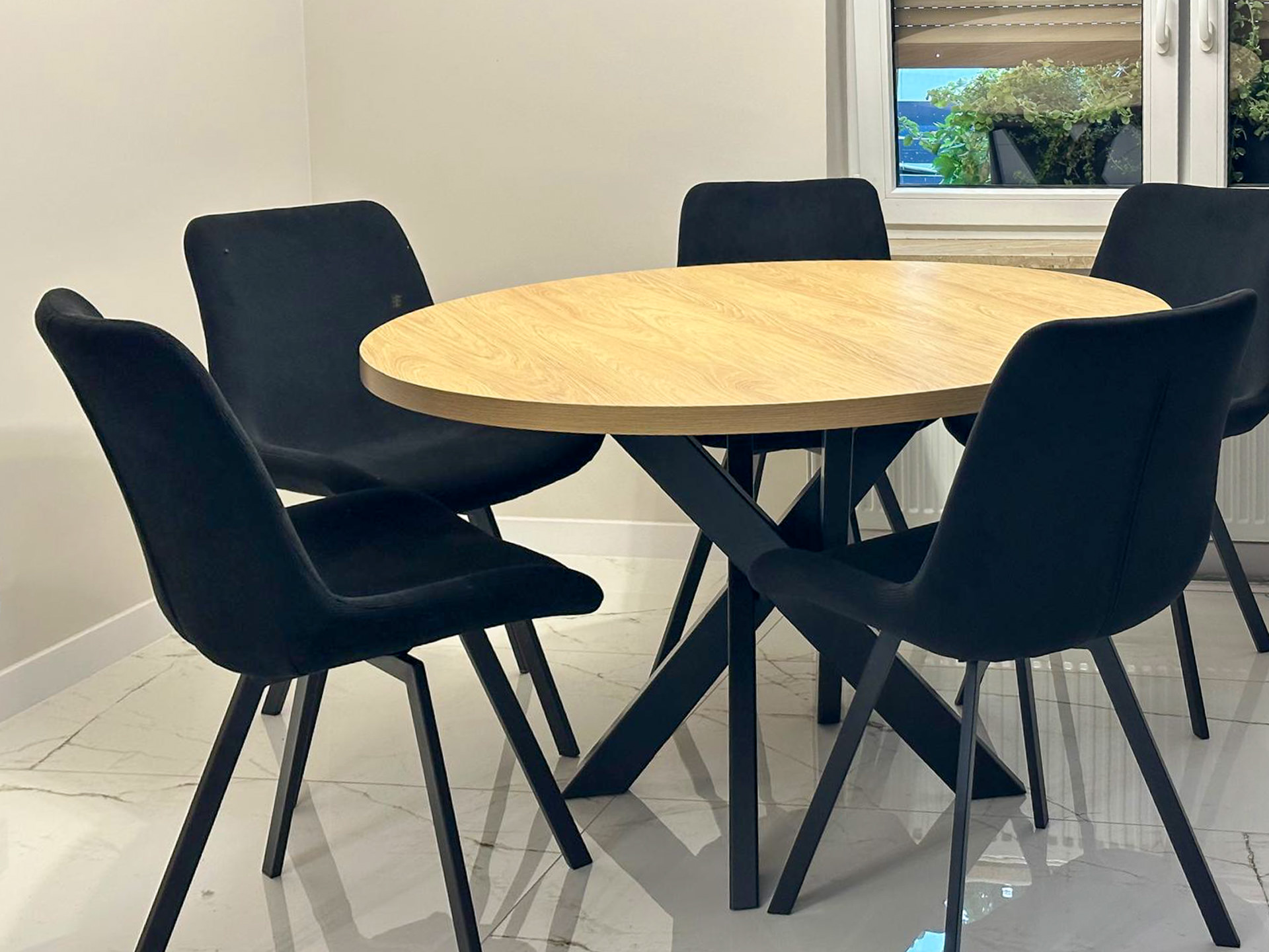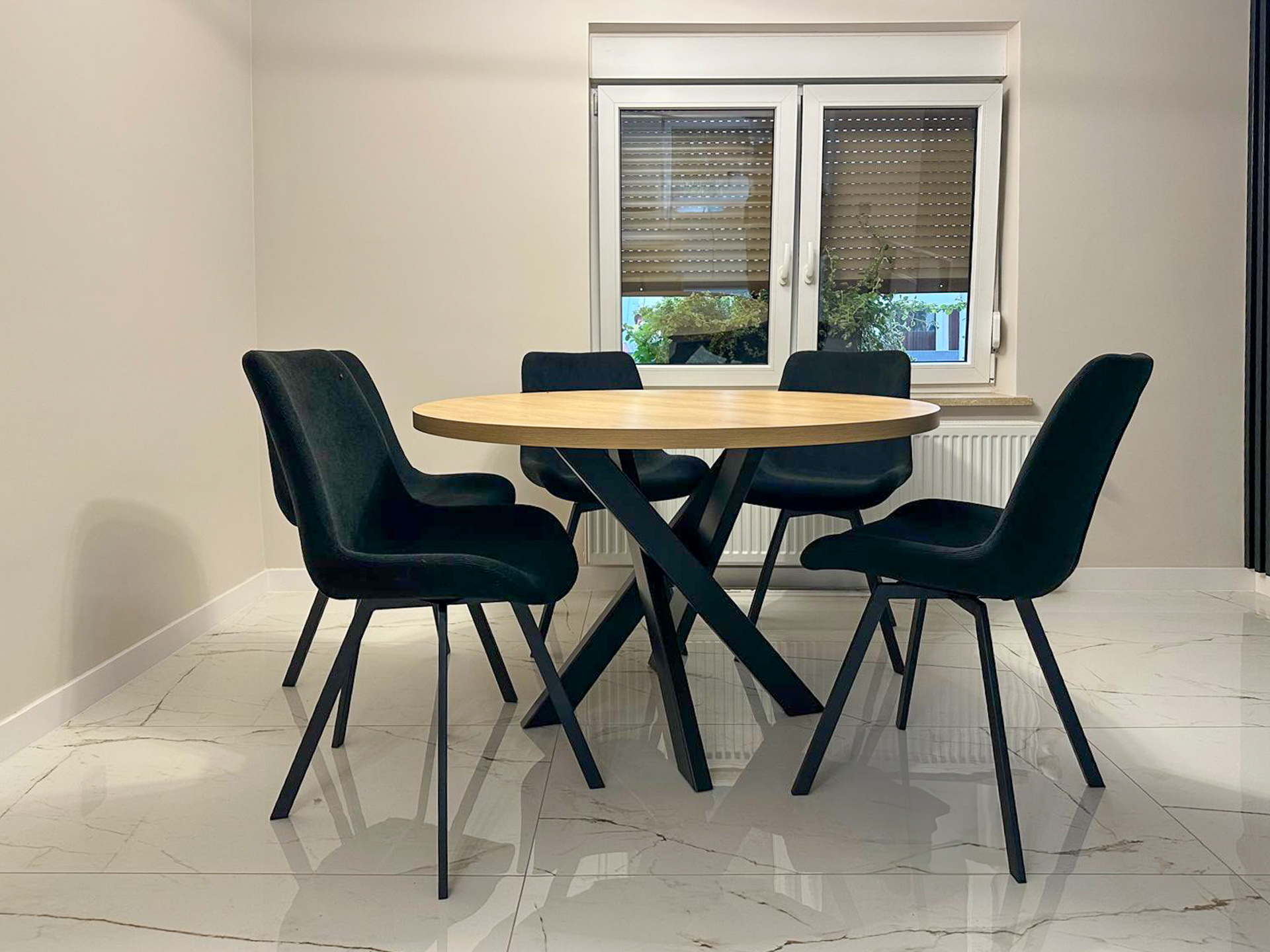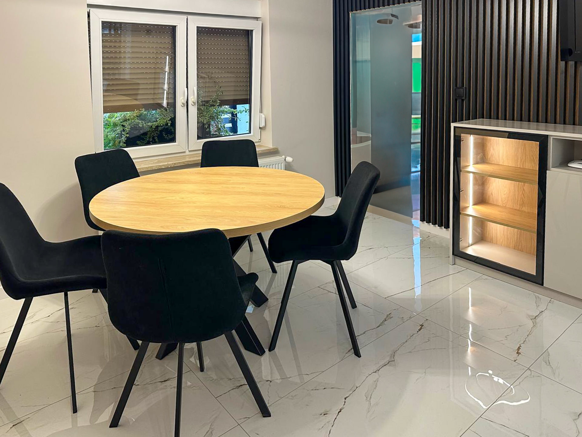 Meble dopasowane do okna narożnego z możliwością jego otwierania.
